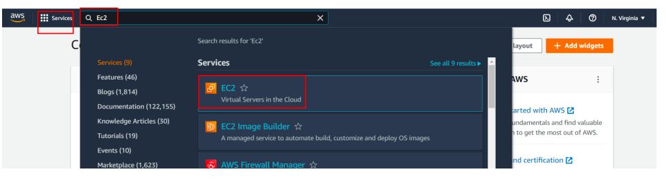 Open AWS-> select agreed region-> search for EC2-> click EC2 services as shown below