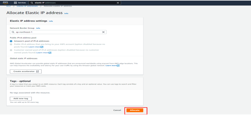 Click Allocate to create new Elastic IP as shown below