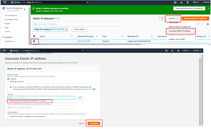 Assign the newly created Elastic IP’s to the newly created OMAX AWS servers as shown below