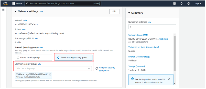 Click Select existing security group and select newly created validator security group as shown below.